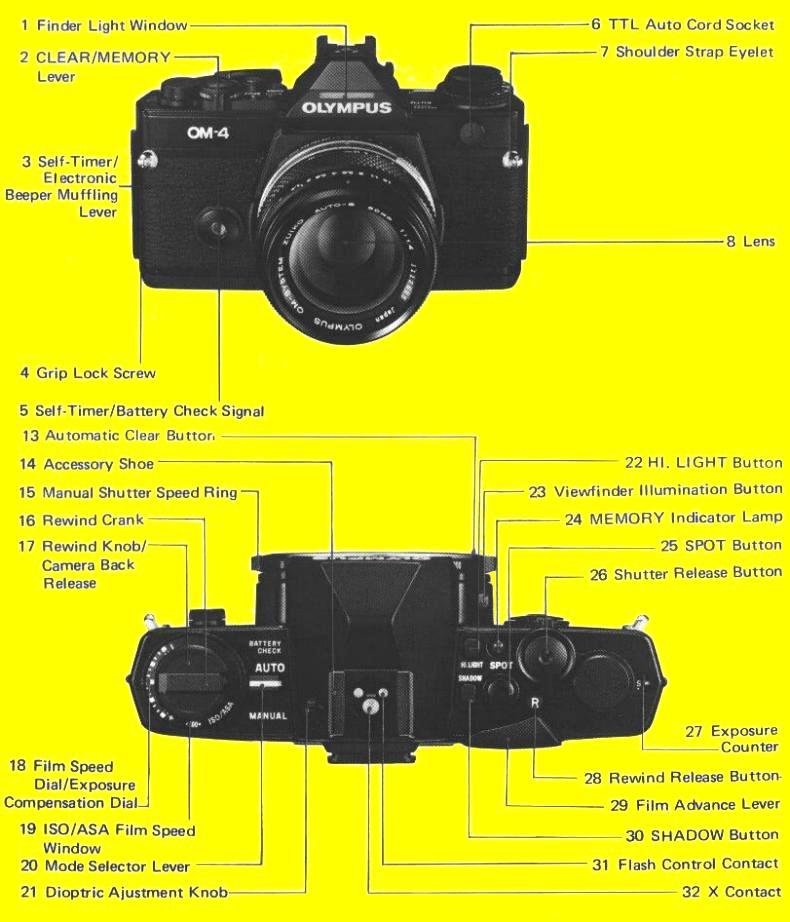 It incorporates the same features as its mechanical sister camera, the OM-3, and adds Auto Exposure, multi spot reading in both Manual and Auto Mode, an Exposure Memory of one hour, and of course TTL "OTF" Flash Exposure to it. Another difference is the presence of the new electronic self-timer in the OM-4; the OM-3 doesn't  have a self-timer at all. The self-timer switch in the OM-4, which also serves as a switch to turn off the beeper, is identical to the self-timer in the OM-SP. When the self-timer is activated the mirror is locked up and the aperture is closed, which can help in reducing vibrations. All OM bodies that were introduced in the first half of the eighties had additional support for Motor Drive 2: advance to first frame when the back is closed. The OM-3 and OM-4 (and of course also their successors, the OM-3Ti and OM-4Ti) are the only bodies that also support motorized film rewind with Motor Drive 2.