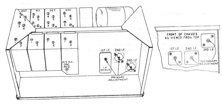 Adjust 215 kc. Osc. Padder to max. output. Repeat No. 1 Band adjustment & 215 kc. Osc. Padder adjustments 2 or 3 times to insure correct tracking and dial calibration. |