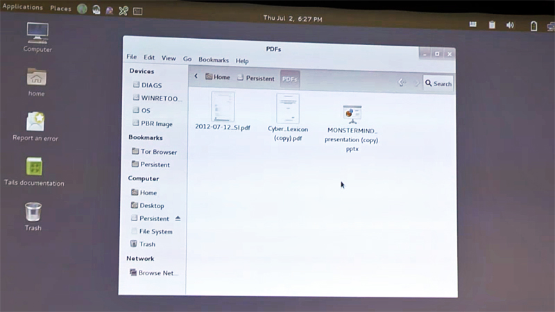 The source had said that for these documents only the external TAILS operating system should be used. The same system was used by other people who worked with Snowden documents, like Laura Poitras, Glenn Greenwald, and Barton Gellman. On the dedicated laptop, Eckert showed an example of what these documents look like: