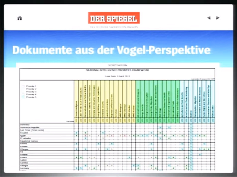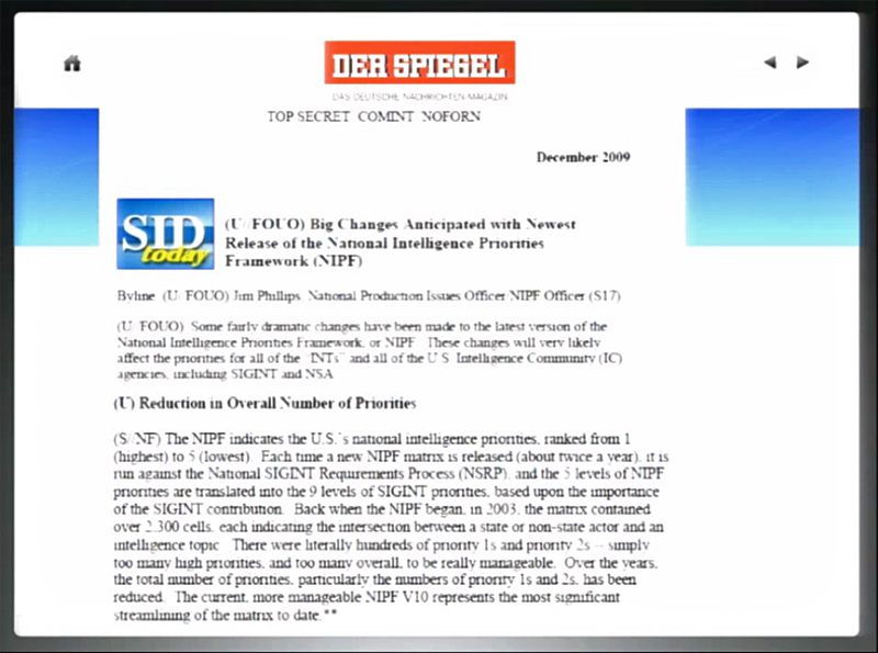 One document that wasn't published, but only reported about is the National Intelligence Priority Framework (NIPF), which contains the priorities for the US intelligence community as set by the White House. During the interview a part of the original NIPF document was shown for the first time: