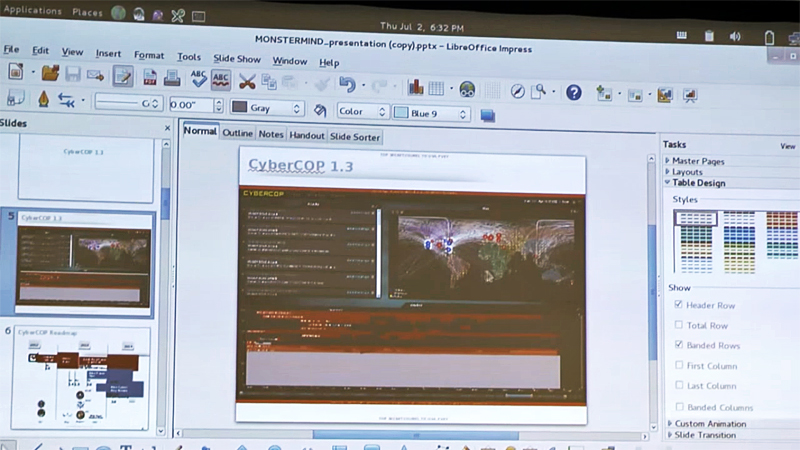 In the window we see for example an internal NSA newsletter with an interview with a hacker from NSA's TAO division, a Cyber Warfare Lexicon and a powerpoint presentation. The latter has the filename "MONSTERMIND_presentation (copy).pptx", but when it was opened, it actually had the cover term CYBERCOP on the front slide and it was prepared by the "CyberCOP Product Manager".