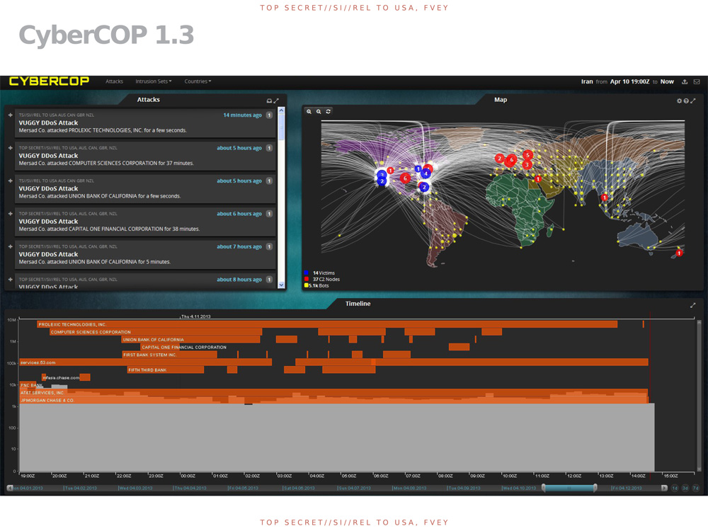 In the documentary itself it was explained that an analysis tool called CYBERCOP makes it possible for NSA to monitor "cyber war" in real time. The presentation described at least one specific attack: on April 10, 2012, the US federal banking system in New York was succesfully attacked by Iran, not directly, but through thousands of computers around the world, controlled through internet servers in Germany.