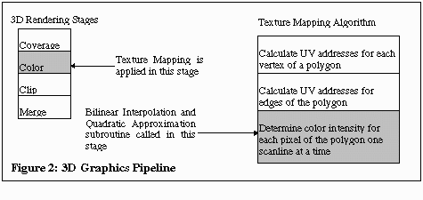 This code does perspective texture mapping with Bilinear Interpolation for filtering and Quadratic Approximation for perspective correction. Figure 2 shows where the algorithm fits in a typical 3D rendering engine.