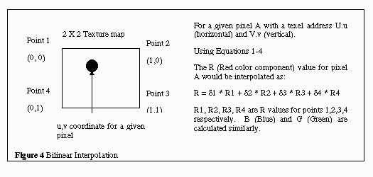 Given a screen pixel point and a texel coordinate (U.u,V.v), the algorithm finds 4 adjacent points on the texture map and interpolates the RGB color intensity for the pixel based on the colors of the 4 points. The RGB color intensity is calculated by multiplying the four points by a weighting factor(equations 1-4) and adding the results, as shown in Figure 4.