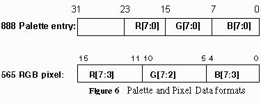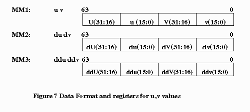 The intensity of a pixel is represented by a 16-bit WORD in which the RGB is stored in a 565 data format: 5 bits for R, 6 bits for G and 5 bits for B. However, the algorithm can be easily modified for 555 color format. The color of a texel is represented by a byte unsigned number. The byte is an index to the color palette entry, where the actual color intensity is stored. Each color palette is represented by a 32-bit DWORD, in which the RGB values, are stored in the lowest 24 bits. A 24-bit color palette is used instead of 565 RGB format because color calculation is done in bytes or words. The (U.u,V.v) coordinates of a texture map are represented by 32-bit DWORD, in which the value is a 16.16 number(16 bit integer part and 16 bit fractional part). The du, dv, ddu, and ddv values also share the same data format. Refer to Figure 6 and 7 for further clarification.