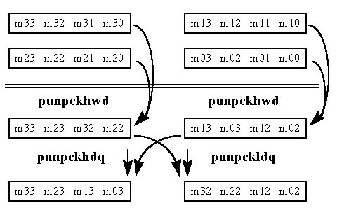 Note: The same algorithm is used in standard integer assembly code, but the block being transposed is a 2 x 2 element block of data.