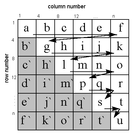 4. Set one pointer to the next 4 x 4 block in the row (from "b" to "c" in this case). Set the other pointer to the next 4 x 4 block in the column (from "b`" to "c`" in this case).