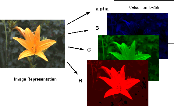 This example assumes that the 24-bit color data is organized so that four pixels at a time are processed from one color plane, that is, the image is separated into individual color planes: one for red, one for green, one for blue. The first four red values from the flower and the swan will be processed first. After finishing the red plane, the processing moves to the green and blue planes.