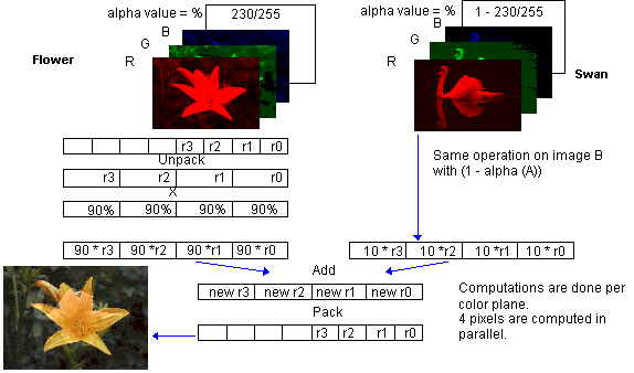 The unpack instruction takes the first four bytes of the red data that are represented in 8-bit values and unpacks each pixel into 16-bit elements, putting them into a 64-bit MMX register. The alpha value, which is computed once per frame, is the other operand. The PMUL multiplies the two vectors in parallel. Similarly, an unpack and PMUL create the intermediate result for the swan. Now the two intermediate results are added together using a PADD and the final result is sent to memory using a PACK that converts the intermediate 16-bit values back to 8-bit pixel values that can be stored.