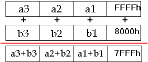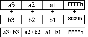 The following example shows a packed add word with wrap around. It performs four additions of the eight, 16-bit elements, with each addition independent of the others and in parallel. In this case, the right-most result exceeds the maximum value representable in 16-bits-thus it wraps-around. This is the way regular IA arithmetic behaves. FFFFh + 8000h would be a 17 bit result. The 17th bit is lost because of wrap around, so the result is 7FFFh.