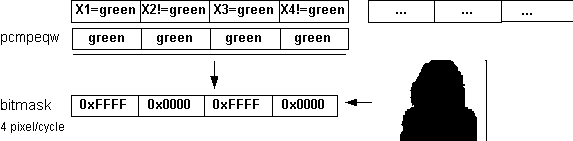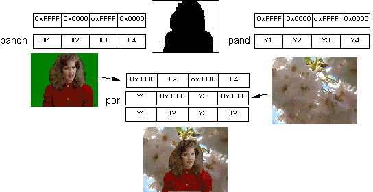 This mask is now used on the same four pixels from the picture with the woman and the equivalent four pixels from the Spring blossom. The "AND NOT" and "AND" instructions use the mask to identify which pixels to keep from the Spring blossom and the woman. They also turn the unwanted pixels to zeros. The "OR" instruction builds the final picture. Four pixels were mapped using only four MMX instructions without any branches.