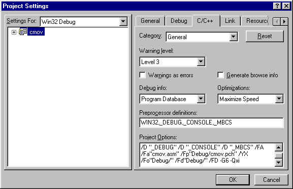 Figure 3.2.2 Project Settings using the Pentium Pro Processor's Optimization Switches