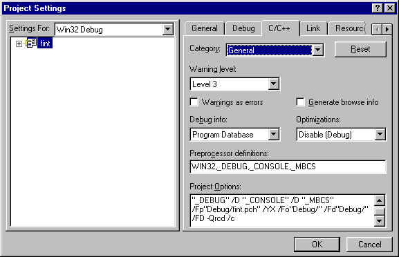 To use the floating point rounding control optimization, the -Qrcd switch must be set in the project settings. Select Project from the menu and choose Settings. A dialog box will appear, select the C/C++ tab and type in the specified settings in the project options box. An example is provided below using the -Qrcd setting as a project option.
