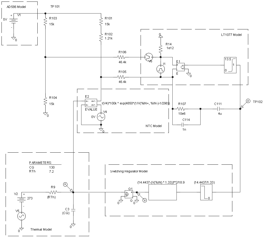 How are the thermal model parameters determined? For the capacitor this was easy: put the oven mass on a scale (~0.145kg) and multiply by the specific heat capacity of aluminium (896 J / kg K). For the thermal resistance one could take surface area (~0.032m^2) and find heat conduction values of typical foams. The problem is to find the right foam and correctly guess the losses due to slots in the foam, and cabling. However, it is much easier to measure the voltage on TP102 and adjust the thermal resistor in the model to obtain the same value. This resulted in a resistor of Rth = 7.2R.