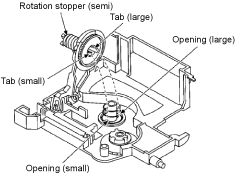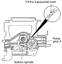 Step 2 Lower down the rotation stopper (semi) and fit the trapezoidal tooth between bottom spindle and relay gear A.