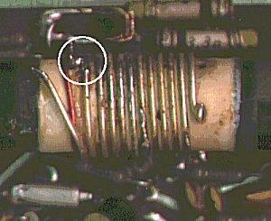 Ich habe nun das Silberdraht-Ende vom Lötstützpunkt abgelötet und links an diesem vorbeigeführt; es endet jetzt dort "in der Luft". Stattdessen habe ich die nächste (vorletzte) Windung etwas näher zum Lötstützpunkt hingezogen und durch eine Lötung (siehe Kreis) mit diesem verbunden. Durch Erwärmen des Drahtes mit dem Lötkolben wird der Fixierlack weich und erlaubt ein moderates Verschieben der vorletzten Windung zum Lötstützpunkt hin. Diese Vorgehensweise - ohne tatsächliches Abwickeln oder gar Abschneiden von Draht - erlaubt es, die Änderung ggf. rückgängig zu machen - aber ich hoffe, das wird nicht nötig sein...