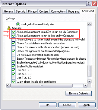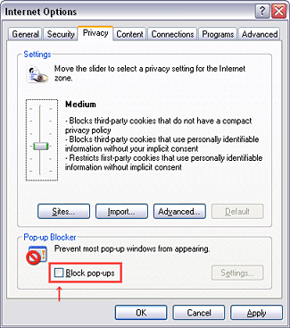 When Windows XP SP2 is used, pop-up windows are limited by the enhanced security function and this sample may not work. In that case, perform the Internet Explorer setting using the following procedure to restore normal operation.