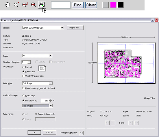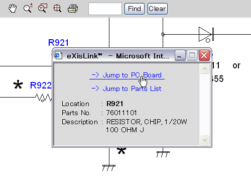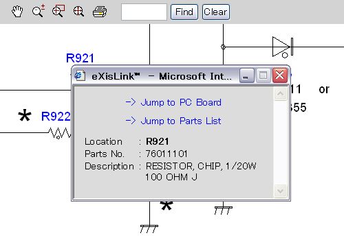 Functions Provided on Each Drawing PageParts Information Reference FunctionWhen the character string of a part on the drawing is clicked, its information is popped up at the location. You can get any parts information immediately on the screen without referring to the maintenance parts list. 8 Parts Search FunctionYou can search any part within the displayed drawing or within the whole schematic diagram/board view by specifying a location number. The pop-up window displayed by clicking a part's character string allows to search the part within the applicable schematic diagram, board view or spare parts list. 8 A circle appears when the part is found, showing the part's location within the drawing. 8 Signal Line/Connector Destination Display FunctionWhen a name at the end of a signal line in a divided schematic diagram is clicked, the destination of the signal is searched and the display changes to the destination. Connecter destinations can also be searched in the same way. 8 When two or more search results are provided, their drawing names are displayed, allowing you to choose a desired drawing to display. 8 Layer Display Changing FunctionWhen any of the color buttons on the toolbar is clicked, it can be selected to display desired layer in its color or not to display each layer. This allows you to see the pattern layer only by setting other layers to "non-display". 8 PC Board View Pattern Highlighting FunctionWhen a pattern on a board view is clicked, it is highlighted in green. This allows easy pattern tracing. 8 Specified Area Printing FunctionThe Autodesk DWF Viewer enables to print the displayed drawing region as it is on a printer. It also allows to print a large-sized drawing in multiple pieces (tile printing). 8