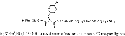 Structure-Activity Studies of the Phe4 Residue of Nociceptin(1-13)-NH2: Identification of Highly Potent Agonists of the Nociceptin/Orphanin FQ Receptor Remo Guerrini, Girolamo Caló, Raffaella Bigoni, Daniela Rizzi, Anna Rizzi, Marina Zucchini, Katia Varani, Eiji Hashiba, David G. Lambert, Geza Toth, Pier Andrea Borea, Severo Salvadori, and Domenico Regoli [Full Article - PDF]