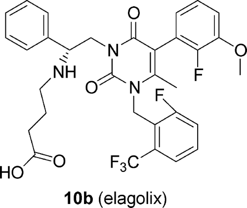 Discovery of Sodium R-(+)-4-{2-[5-(2-Fluoro-3-methoxyphenyl)-3-(2-fluoro-6-[trifluoromethyl]benzyl)-4-methyl-2,6-dioxo-3,6-dihydro-2H-pyrimidin-1-yl]-1-phenylethylamino}butyrate (Elagolix), a Potent and Orally Available Nonpeptide Antagonist of the Human Gonadotropin-Releasing Hormone Receptor Chen Chen, Dongpei Wu, Zhiqiang Guo, Qiu Xie, Greg J. Reinhart, Ajay Madan, Jenny Wen, Takung Chen, Charles Q. Huang, Mi Chen, Yongsheng Chen, Fabio C. Tucci, Martin Rowbottom, Joseph Pontillo, Yun-Fei Zhu, Warren Wade, John Saunders, Haig Bozigian and R. Scott Struthers 7478-7485