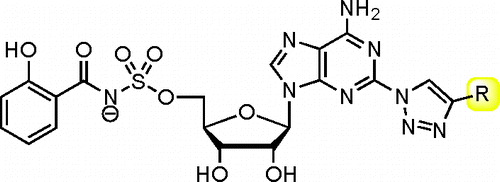 Inhibition of Siderophore Biosynthesis by 2-Triazole Substituted Analogues of 5′-O-[N-(Salicyl)sulfamoyl]adenosine: Antibacterial Nucleosides Effective against Mycobacterium tuberculosis Amol Gupte, Helena I. Boshoff, Daniel J. Wilson, João Neres, Nicholas P. Labello, Ravindranadh V. Somu, Chengguo Xing, Clifton E. Barry, and Courtney C. Aldrich 7495-7507