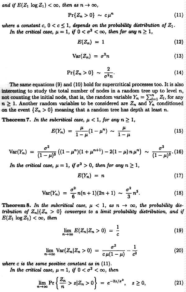 A branching process is called subcritical, critical, or supercritical if µ < 1, µ = 1, or µ > 1, respectively. The extinction probability defined as the probability of a tree being finite is 1 for subcritical and critical (provided p0 > 0) processes and smaller than 1 for supercritical processes. We are here only interested in subcritical and critical processes, whose main properties are given by the following theorem, see [2], [10]. Let sigma2 = Var(Z1) be the variance of Z1.