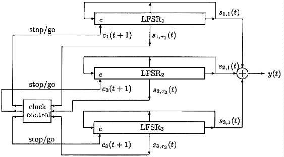 Let ci = (ci(t))ºº t = 1 denote the binary clocking sequence for LFSRi (it is clocked if ci(t) = 1 and not clocked if ci(t) = 0) which is derived from the clock-control sequence C in an obvious way. Equation (2) can formally be used to generate the initial bit y(0) from S(0), so that y = (y(t))ºº t = 0 is called the output sequence. The first 100 output bits, (y(t))100 t = 1, are discarded, the following 114 bits are used as the keystream for one direction of communication in the full-duplex mode, then the next 100 bits are again discarded, and the following 114 bits are used as the keystream for the reverse direction of communication. The encrypted messages are thus very short and the resynchronization is frequent.