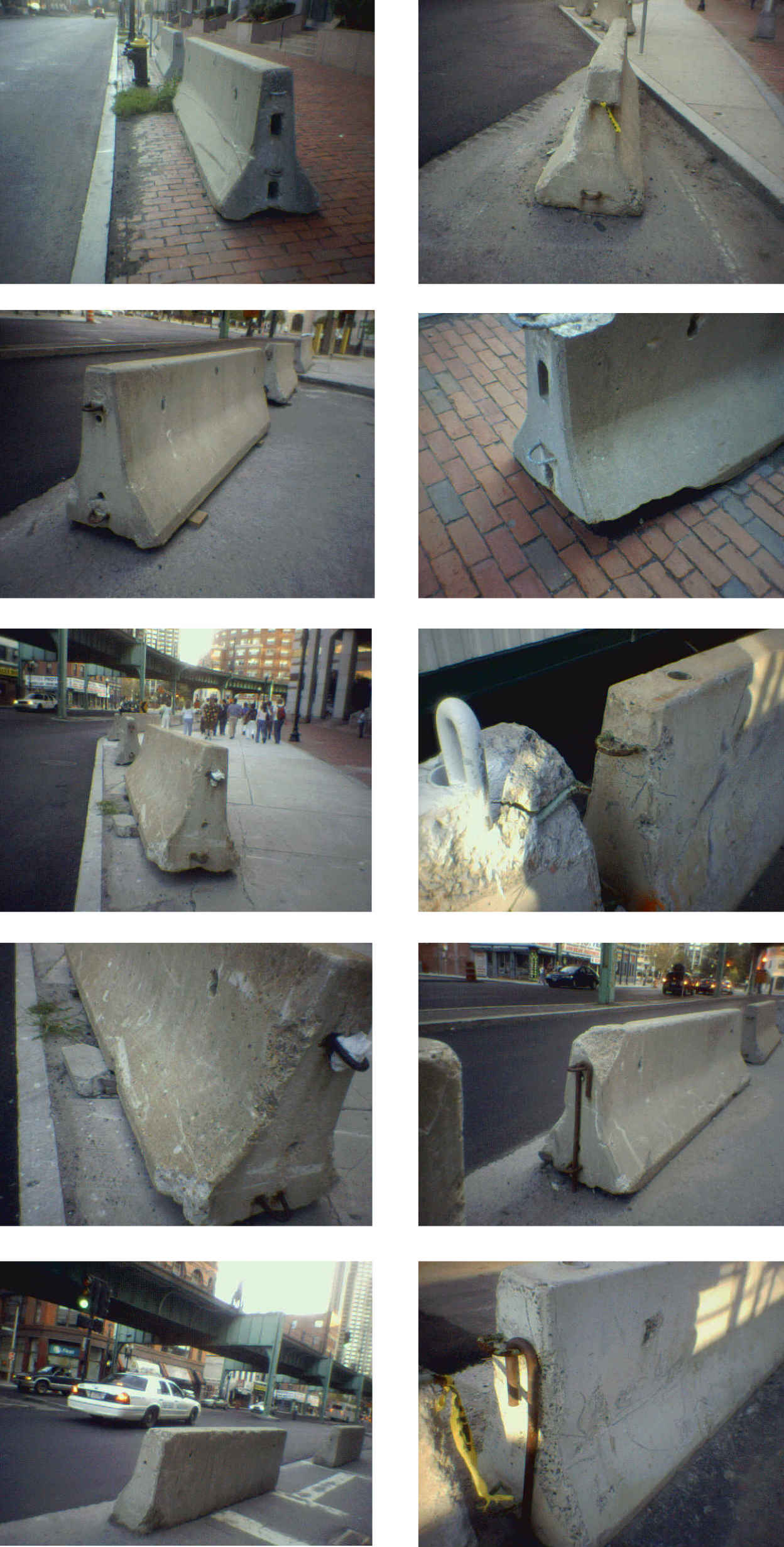 2. Inept Security Barrier Installation.The "Jersey Barriers" and barricades that have been erected around these areas are a complete joke, and serve no purpose than to give people a place to sit while eating lunch. The barriers are scattered in an extremely haphazard arrangement, and are not effective as a security measure against anything larger than a Toyota Echo driven by a drunk freshman. The have not been staked down with heavy steel bars about 5-6 ft long. Also, most of the barriers lack the "J-hooks" that lock the barriers together, and then extends into the ground. Also, these Jersey barriers also have to be bound together with either grade 80 or 100 3/8-inch chains, or three strands of 3/8-inch steel cable. The barriers are in extremely poor conditions, are not properly installed, and provide nothing more than an illusion of security. Anybody with even a small pickup truck could push several out of the way. Anyone with a larger truck (i.e., a 24-ft Ryder Truck) would have no problem slamming into these barriers, knocking them out of the way, and engaging in a nefarious action. |