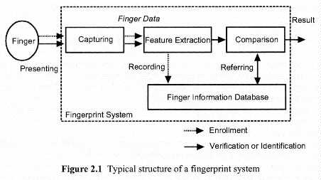 of living bodies. 2. FINGERPRINT SYSTEMS 2.1 Fingerprint Systems The principle of fingerprint systems is schematically illustrated in Fig. 2.1. In an enrollment process, the system captures finger data from an enrollee with sensing devices, extracts features from the finger data, and then record them as template with a personal information, e.g. a personal identification number (PIN), of the enrollee into a database. We are using the word "finger data" to mean not only features of the fingerprint but also other features of the finger, such as "live and well" features. In an identification (or verification) process, the system captures finger data from a finger with sensing devices, extracts features, identifies (or verifies) the features by comparing with templates in the database, and then outputs a result as "Acceptance" only when the features correspond to one of the templates.