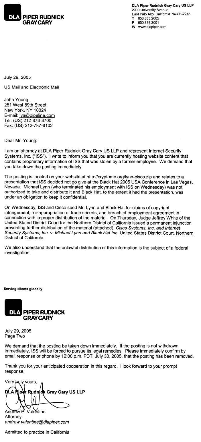 Similar demands have been sent to Richard Forno, Tom's Networking and perhaps others. Cryptome welcomes for publication information on others and their ISPs who have received these demands. Send to jya[at]pipeline.com. Anonymous and encrypted okay. PGP PK here.