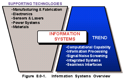 Overview (See Figure 8.0-1) Information Systems (IS) are defined as the entire infrastructure, organization, personnel and components that collect, process, store, transmit, display, disseminate and act on information. IS include several functional areas: acquisition, organization, and management of data; processing and manipulation of data; information storage and retrieval; human-system interfaces; and means for ensuring the reliability and security of information and system resources. Most technologies used in information systems are dual use. New technologies and products are emerging daily. Performance of processors and capacity of memory chips has doubled every 18 months since 1970. This exponential growth is expected to continue until the year 2005. In addition to technology for the hardware and software components of reliable and secure information systems, other technology, in the form of specialized know-how for system design and integration, is necessary to meet important military requirements for C4I2 , intelligent systems, modeling and simulation, and strategically essential industrial CAD/CAM uses. Also, IS are the primary "enabler" and a target for Information Warfare (see Section 9). The technology areas listed in the box nearby contain militarily critical technologies. To avoid duplication, specific technology items are listed under the most appropriate heading in Figure 8.0-2, which highlights the key dependencies among the technology areas and Information Warfare.
