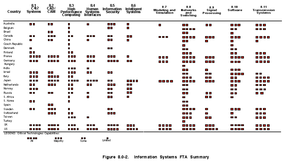 Foreign Technology Assessment (See Figure 8.0-2) The US leads in system engineering and integration of complex information systems specially designed for military use. The US is closely followed by the UK, France, Germany, Canada and Japan. The underlying technologies for IS and for wide area integration of such systems are being driven largely by commercial infrastructure needs and markets. A significant number of countries have developed capabilities equivalent to those of the US in network switching and transmission. The US has sustained its lead in computing hardware because of superior microprocessor design and fabrication capabilities (see Sections 5 and 10). While the US continues to be the only country with critical capabilities in all IS technology areas, equivalent capabilities are found in one or more other countries in every area. The growing multi-nationalizaton of information systems developments has increased the worldwide availability and accessibility of critical technologies. A high rate of IS knowledge transfer from the US to foreign competitors occurs through open source US trade journals, technical literature, various international fora, the Internet, and intelligence. As a result, the US technology leadership in communications and computer systems has declined in recent years relative to Europe and Japan. However, the US is the only country with the ability to supply empirically validated system engineering and integration know-how to large, complex military systems. This capability sets the US apart as the world leader.