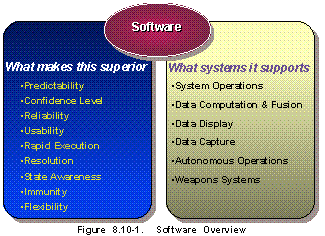 Overview (See Figure 8.10-1) Software consists of two components: (1) the applications matters, which contains algorithms, functions or logic, and parameters and (2) the code, which enables electronic computers to implement the applications. Militarily critical software applications are included in other sections of the MCTL as separate technology items or as "Unique Software and Parameters" in data tables. These applications use validated software that is generally related to one or more operational or developmental military systems. This subsection identifies the know-how that makes the second component, software code, militarily critical. There are two aspects to code: product and process. As product, code is considered militarily critical when it meets criteria in Table 8.10-1 under Military Critical Parameters. Process technologies in the development and life cycle support of software code -- in such activities as configuration management, testing, metrics/measurement, integrated documenta-tion, and architecture -- involve technologies that are not currently militarily critical.