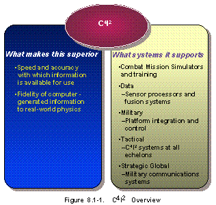 Overview (See Figure 8.1-1) C4I2 comprises a multi-disciplined set of techniques to provide seamless communications, information management, and distribution, and decision-making in the new JCS Vision 20/0, improving situational awareness and effectiveness of warfighting forces in high-intensity combat situations. C4I2 is dependent on underlying hardware and software technologies covered elsewhere in this section. In addition, elements of C4I2 are also essential for development and operational integration of dynamic training, modeling, and simulation (see Figure 8.1-2). Battlespace environment has been explicitly identified as one of DoD's key technology areas for C4I2 and encompasses the following as key elements: weather prediction; propagation sensor modeling and performance prediction; and the underlying information management and human interface technologies required for effective use. While primarily aimed at military situational awareness and dynamic training and combat simulation, the technologies in question will find widespread commercial use in entertainment, education, and science and engineering.