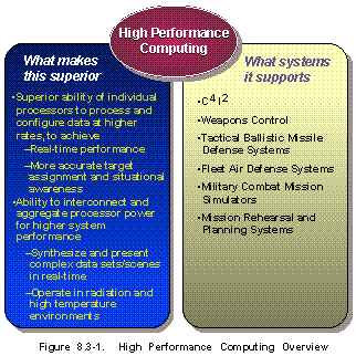 Overview (See Figure 8.3-1) High-performance computing encompasses conventional general-purpose digital computer processing equipment, including microprocessor-based single and multi-processor systems (including vector processors, array processors and other computers) and massively parallel and scalable computing. Also addressed in this section are graphic accelerators and image generators and programmable interconnections specially designed for aggregating high-performance processors to increase effective system power. Computers and software are explicitly identified as key technology areas in the DoD Technology Area Plans. High-performance computing is also critical to meet long-range S&T goals for battlefield digitization, human systems interfaces, manufacturing science and technology, and battlespace environment. High performance computing is an evolving technology for design of advanced military systems. (See also Section 8.2, CAD/CAM Technology.)