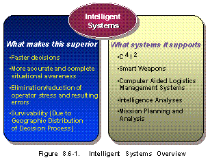Rationale (See Table 8.6-1) The range and lethality of weapons available to potential adversaries have increased dramatically. Intelligent systems, in the form of smart sensors and autonomous vehicles and weapons, have the potential of increasing mission effectiveness while reducing exposure of human operators. As pilot's assistants, this technology can also reduce manpower and training requirements, again while maintaining or improving effectiveness. These same features will also enhance our ability to analyze military operations in realistic scenarios and conditions for system development, development of tactics and doctrine, and mission planning and rehearsal. Finally, intelligent systems are needed as part of battle management and C4I2 systems to sustain US forces' superior ability to detect, localize, and effectively engage enemy forces in a high-threat/ target-rich environment.