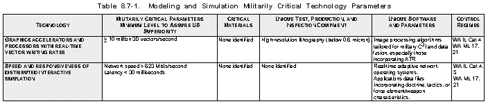 Rationale (See Table 8.7-1) Three considerations drive the criticality of this technology. The first is force training and readiness. Decreasing funding, increasing operating costs, and escalating sophistication of threats and the operational scenarios in which those threats will be encountered make it impossible to develop essential combat skills in the field. The second is in industrial base preparedness. One of the effects of downsizing has been the deferral of engineering and manufacturing development of advanced systems in favor of extended technology development and demonstration programs. The risk of delaying engineering and production is reduced directly in proportion to our ability to do the critical engineering in modeling and to simulate manufacturing processes accurately. Finally, this technology plays an essential role in operations, where modeling and simulation will be critical to effective representation of battlespace environments. In C3I, modeling and simulation enable commanders to do realistic mission rehearsal and preparation, explore options, and optimize force disposition and tactics.