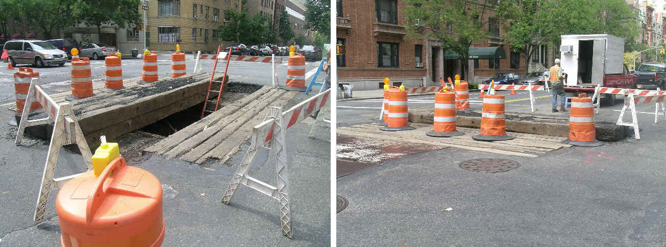 Walking east on West 75th Street, temporary steel pit covers were seen atop the pipeline at Columbus Avenue and workmen were unloading excavation shoring, apparently for work to begin after the weekend.