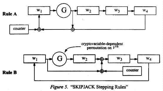 high-order byte, and Y is the low-order byte.2. Basic Structure: SKIPJACK encrypts 4-word (i.e., 8-byte) data blocks by alternating between the two stepping rules (A and B) shown below. A step of rule A does the following: