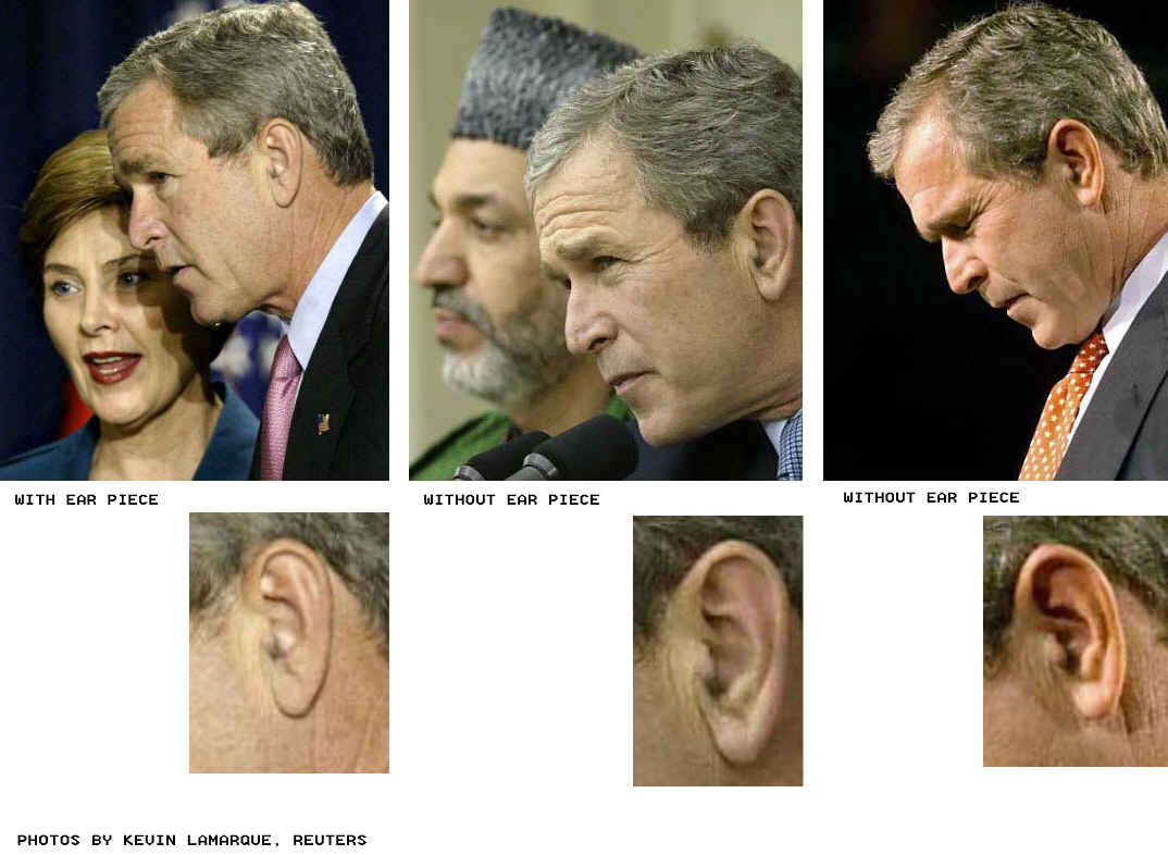 21 October 2004. James Atkinson (www.tscm.com), a technical countersurveillance professsional, doubts Bush is wearing an ear piece as suggested below, instead lighting reflection produces the effect shown. He notes that in-ear devices have visible components on their surface, not the smooth surface seemingly in the left-ear Bush photo, although two devices in the middle-left hearing-aid photos below are fairly smooth. If Atkinson is correct, there appear to be no photos of Bush wearing an in-ear receiver such as that shown below of a cueing system to supplement photos of what is alleged to be a transmitter on his back.