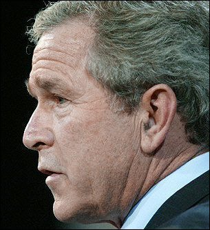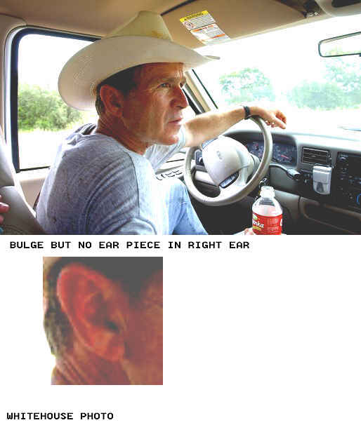 Cryptome has reviewed several hundred close-up photos of Bush's ears and only one appears to show a hearing device and it, too, could be challenged as an effect of lighting as Jim Atkinson describes below: