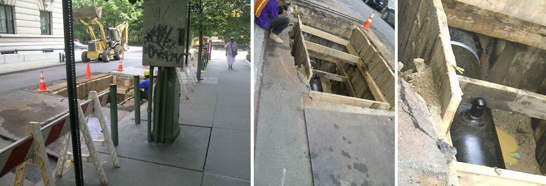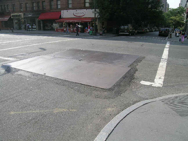 Returning in about an hour, the pit had been covered with steel plates. Several other steel plates nearby appeared to have been in place for some time, indicating that earlier excavations remained open under the plates awaiting completion of work.