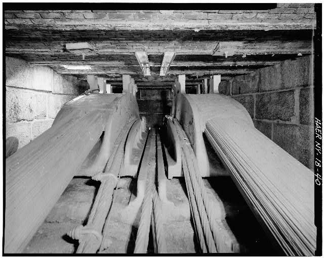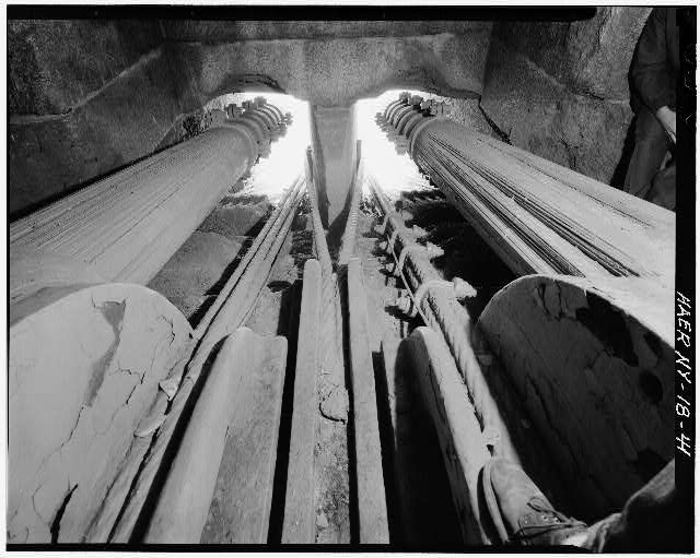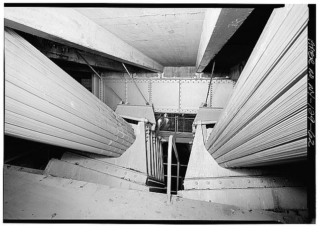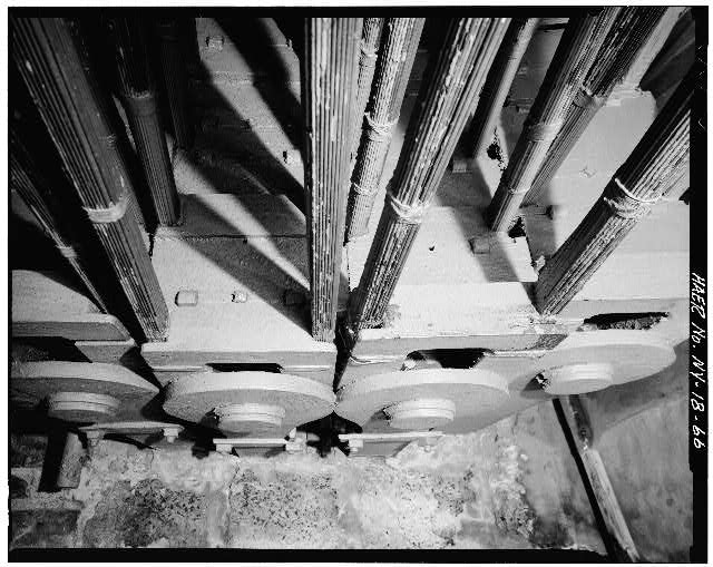 40. View inside Brooklyn Tower looking at cast-iron saddles for two center cables. Jet Lowe, photographer, 1982.