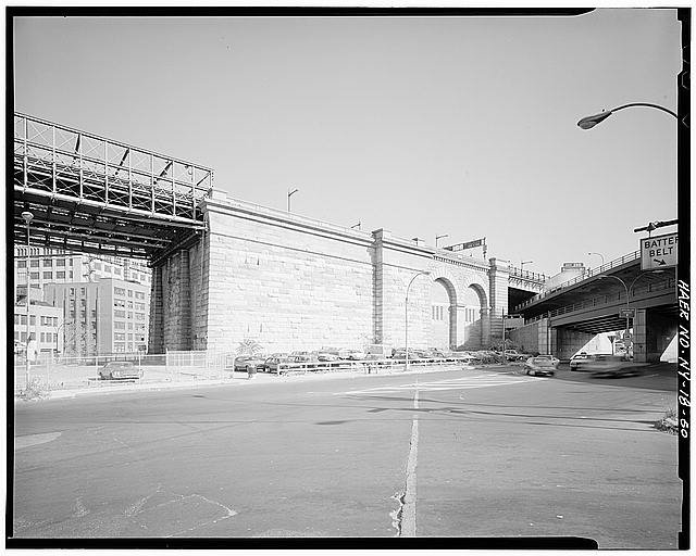 60. Ground level view looking E at Brooklyn anchorage abutment. Jet Lowe, photographer, 1982.
