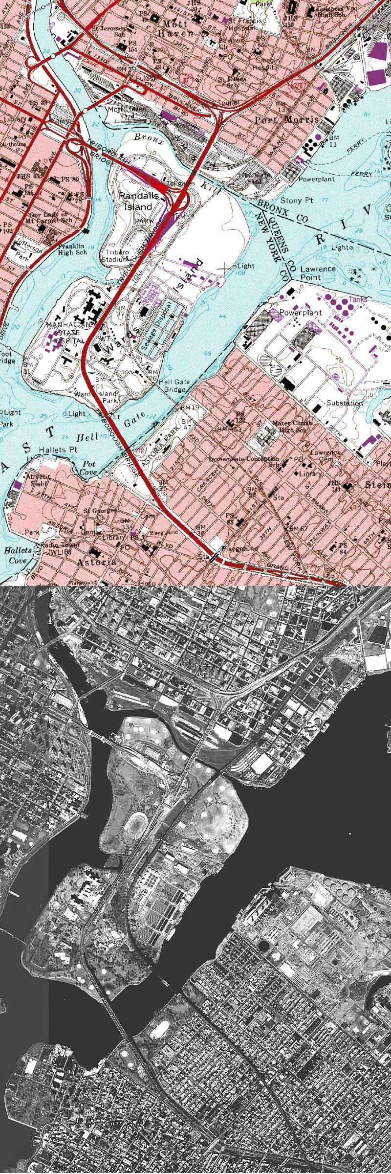 Triborough Bridge at left, Hell Gate Railroad Bridge at right.
