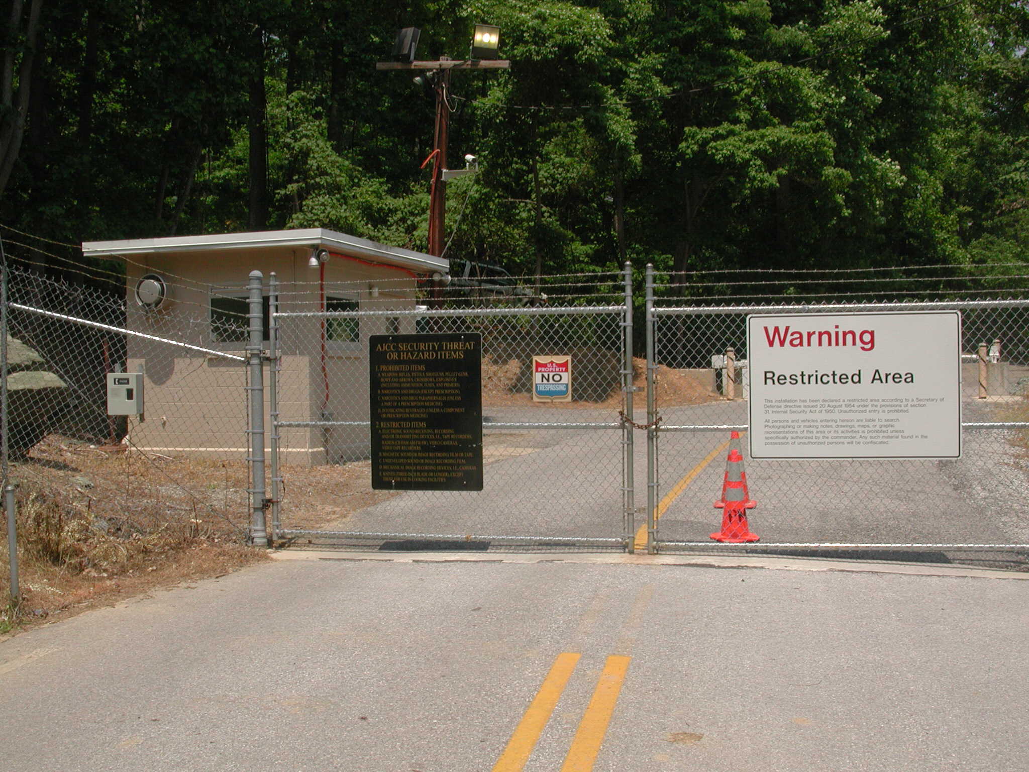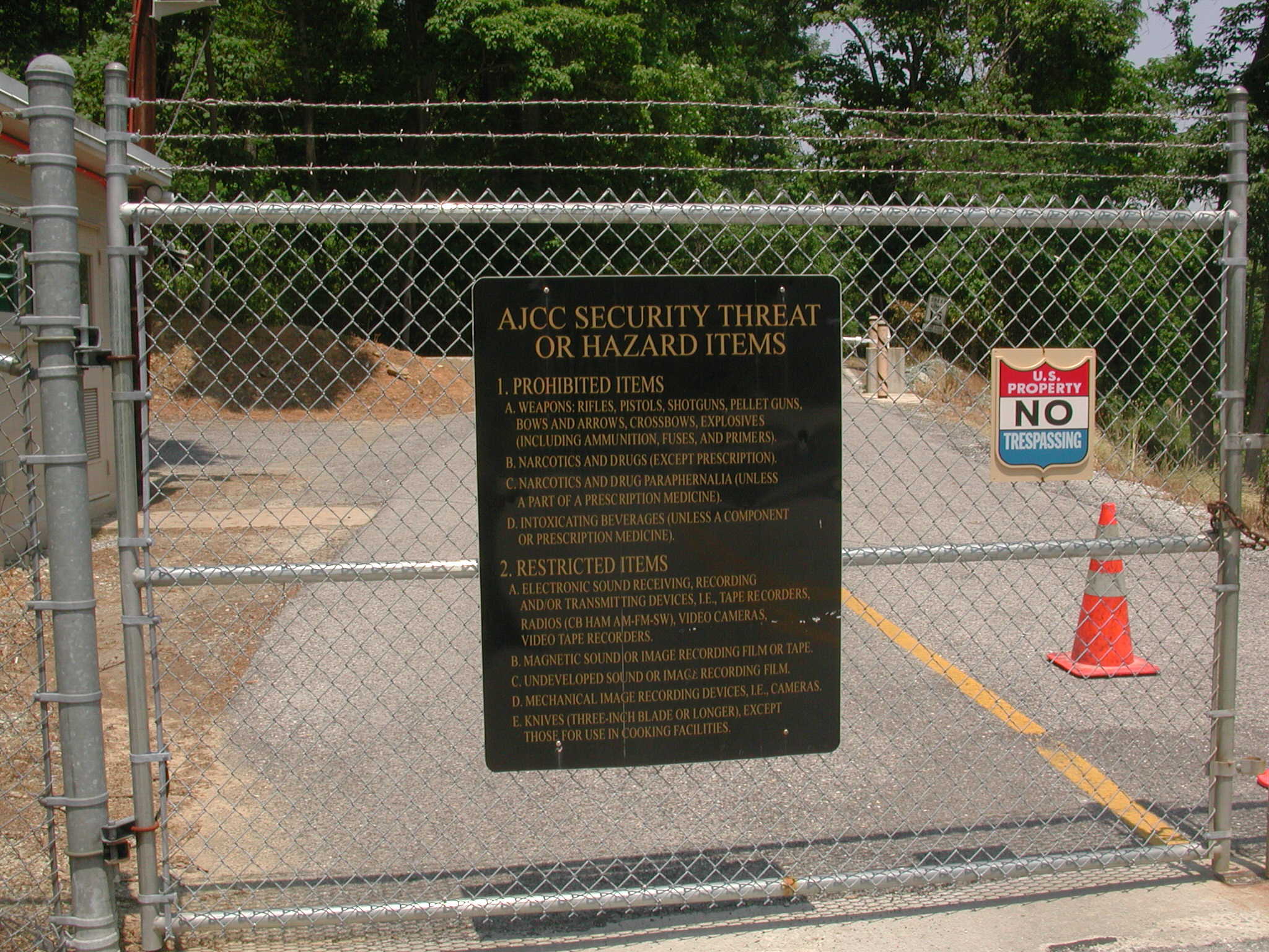 were visible but who knows. A card-activated phone box is on the fence at left. Concrete barriers required vehicles to