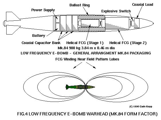 Other alternatives are possible. One is to simply guide the bomb very close to the target, and rely upon the near field produced by the FCG winding, which is in effect a loop antenna of very small diameter relative to the wavelength. Whilst coupling efficiency is inherently poor, the use of a guided bomb would allow the warhead to be positioned accurately within metres of a target. An area worth further investigation in this context is the use of low frequency bombs to damage or destroy magnetic tape libraries.