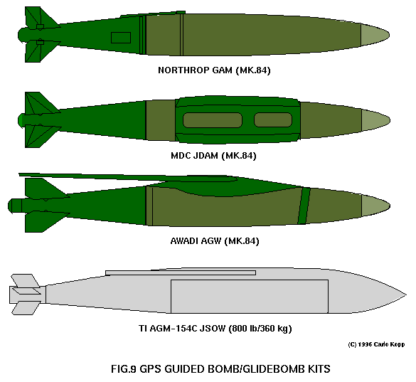 The recent advent of GPS satellite navigation guidance kits for conventional bombs and glidebombs has provided the optimal means for cheaply delivering such weapons. While GPS guided weapons without differential GPS enhancements may lack the pinpoint accuracy of laser or television guided munitions, they are still quite accurate (CEP \(~~ 40 ft) and importantly, cheap, autonomous all weather weapons.
