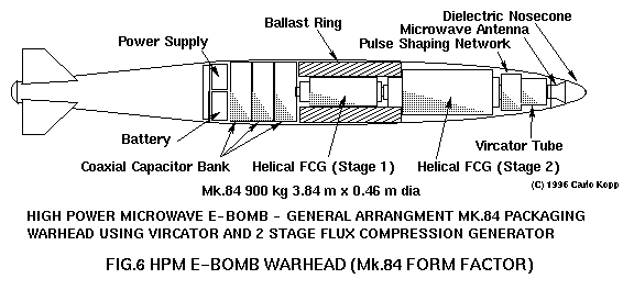 6 Fulghum D.A., ALCMs Given Non Lethal Role, AW&ST, Feb 22, 1993. This recent report indicates that the US has progressed significantly with its development work on electromagnetic warhead technology. An electromagnetic warhead was fitted to the USAF AGM-86 Air Launched Cruise Missile airframe, involving both structural and guidance system modifications. The description in this report suggests the use of an explosive pumped flux generator feeding a device such as a Vircator. References to magnetic coils almost certainly relate to the flux compression generator hardware.