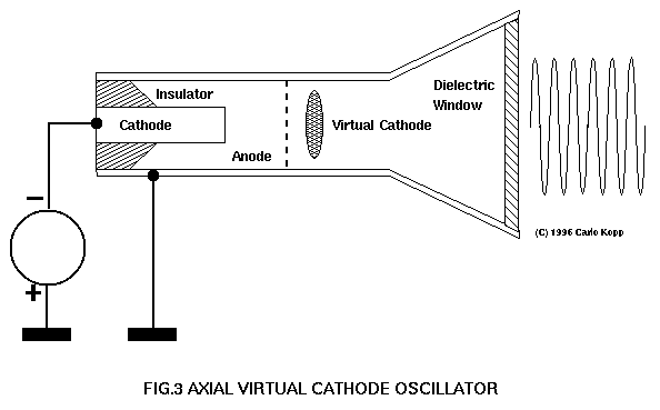 The physics of the Vircator tube are substantially more complex than those of the preceding devices. The fundamental idea behind the Vircator is that of accelerating a high current electron beam against a mesh (or foil) anode. Many electrons will pass through the anode, forming a bubble of space charge behind the anode. Under the proper conditions, this space charge region will oscillate at microwave frequencies. If the space charge region is placed into a resonant cavity which is appropriately tuned, very high peak powers may be achieved. Conventional microwave engineering techniques may then be used to extract microwave power from the resonant cavity. Because the frequency of oscillation is dependent upon the electron beam parameters, Vircators may be tuned or chirped in frequency, where the microwave cavity will support appropriate modes. Power levels achieved in Vircator experiments range from 170 kiloWatts to 40 GigaWatts over frequencies spanning the decimetric and centimetric bands [THODE87].